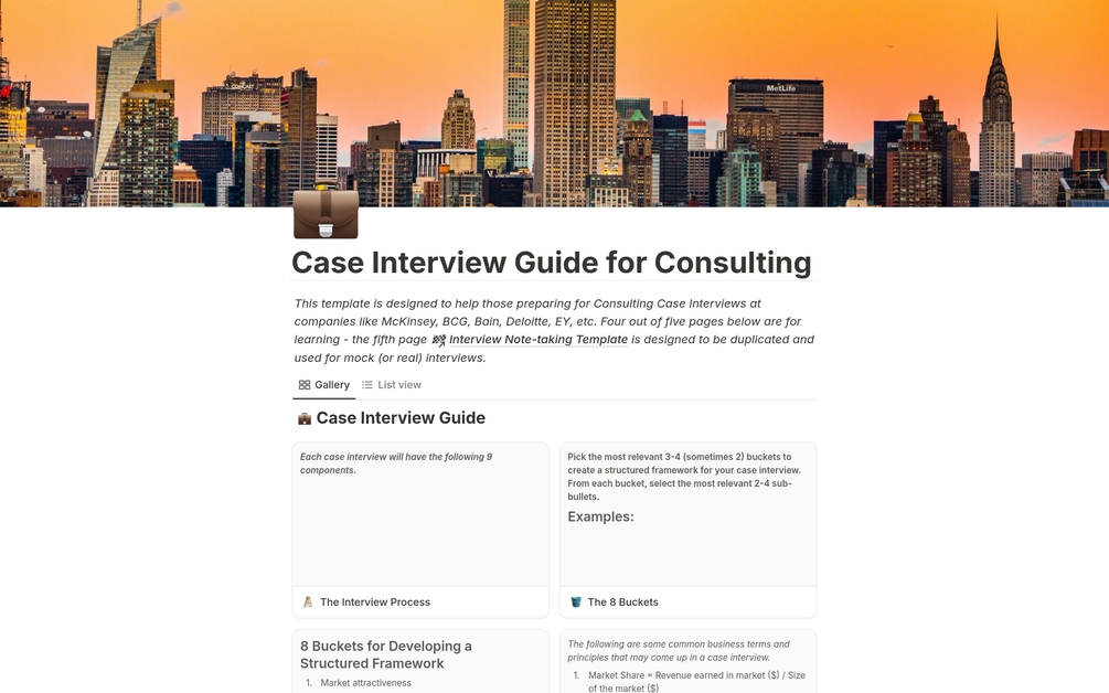 Four out of five pages below are for learning—different components of the interview, buckets you need to memorize to create a structured framework, as well as common quantitative and qualitative concepts you need to know about.